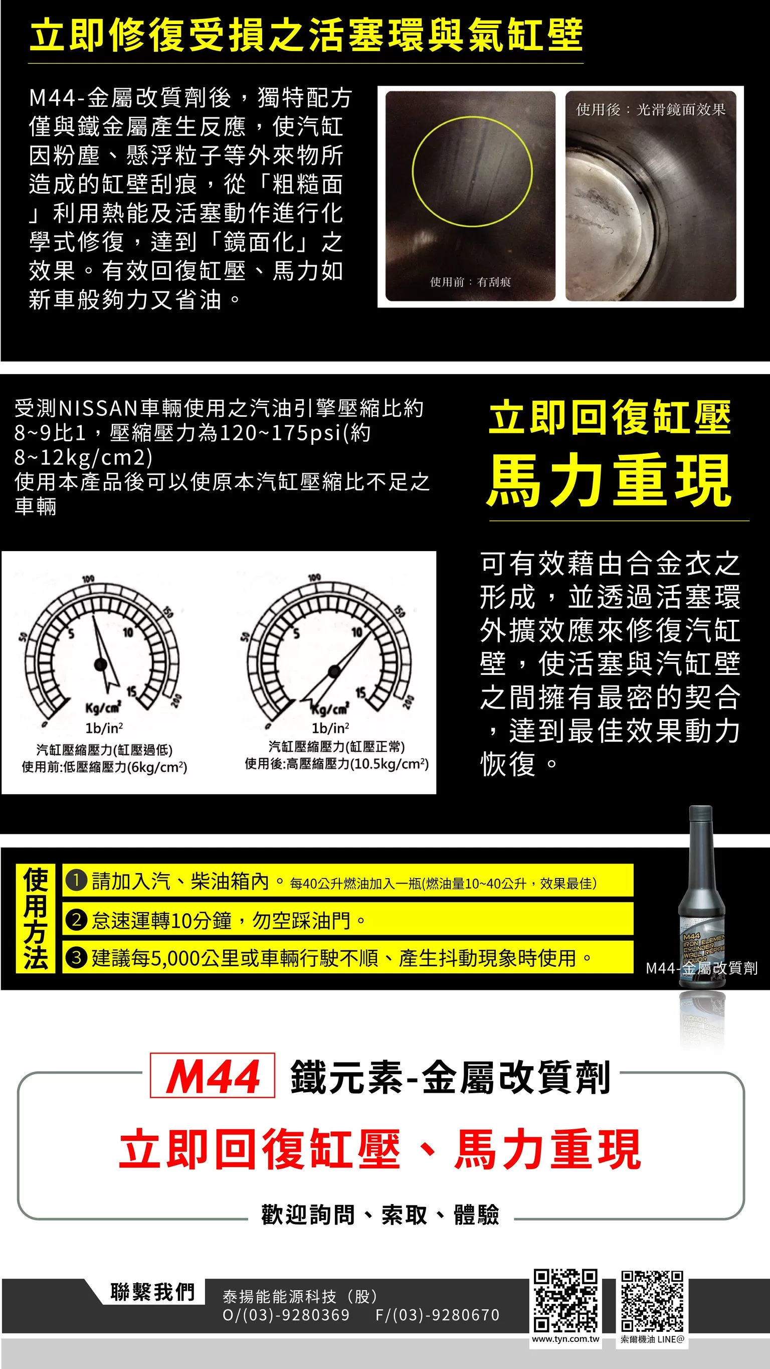 ●添加比率:40公升燃油添加1瓶M44。【建議使用量:燃油量底限不得低於10公升】最好是燃油量40公升以下、10公升以上,因為可在最快時間內完成修補動作。